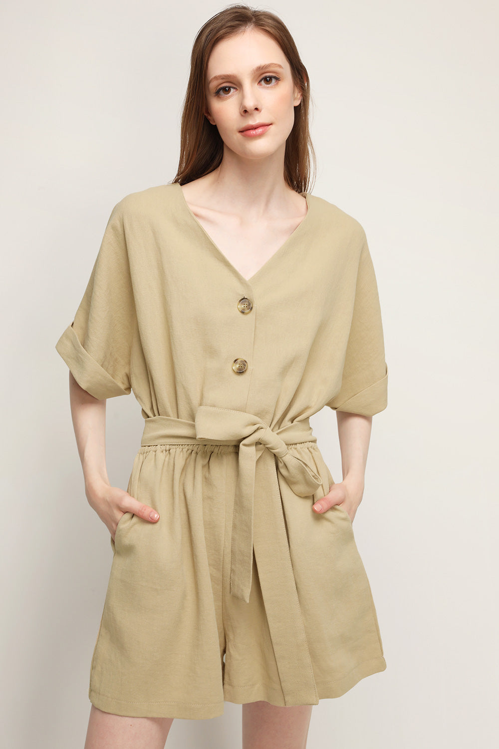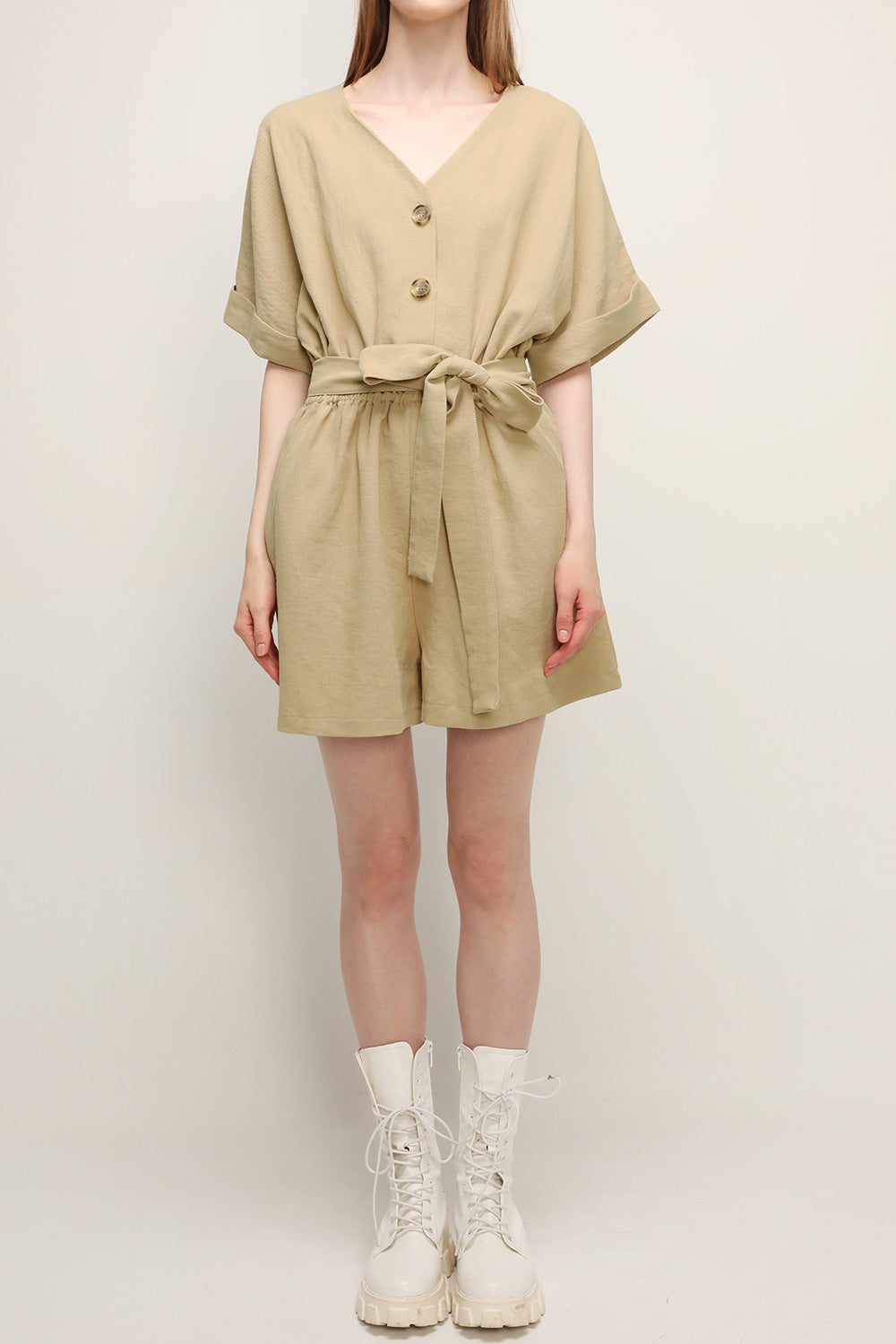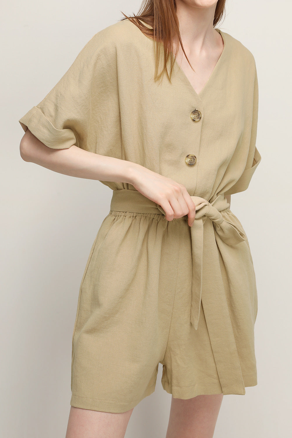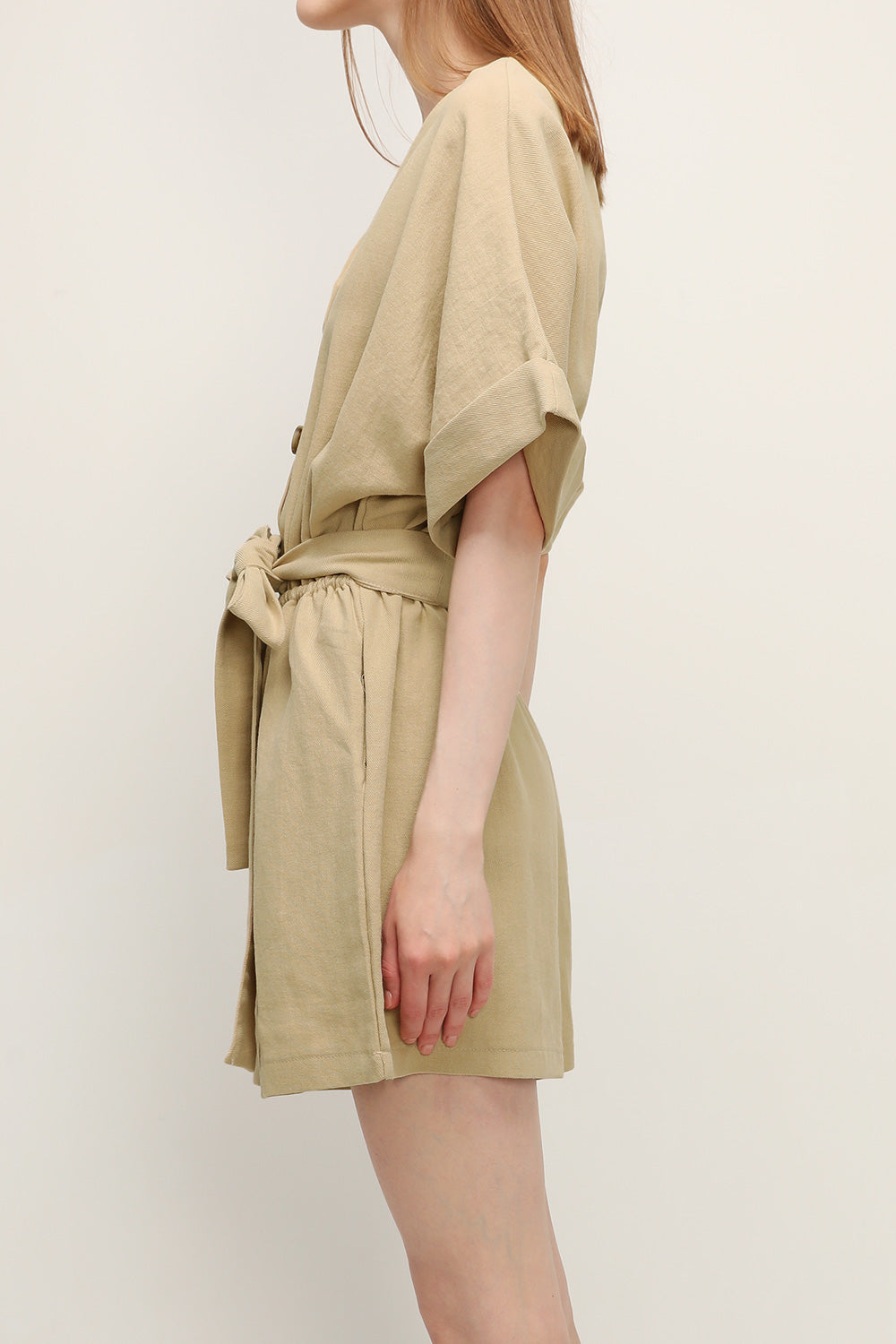 • Featuring a collarless neckline, button closures at front, and an elasticized waist with a same belt included