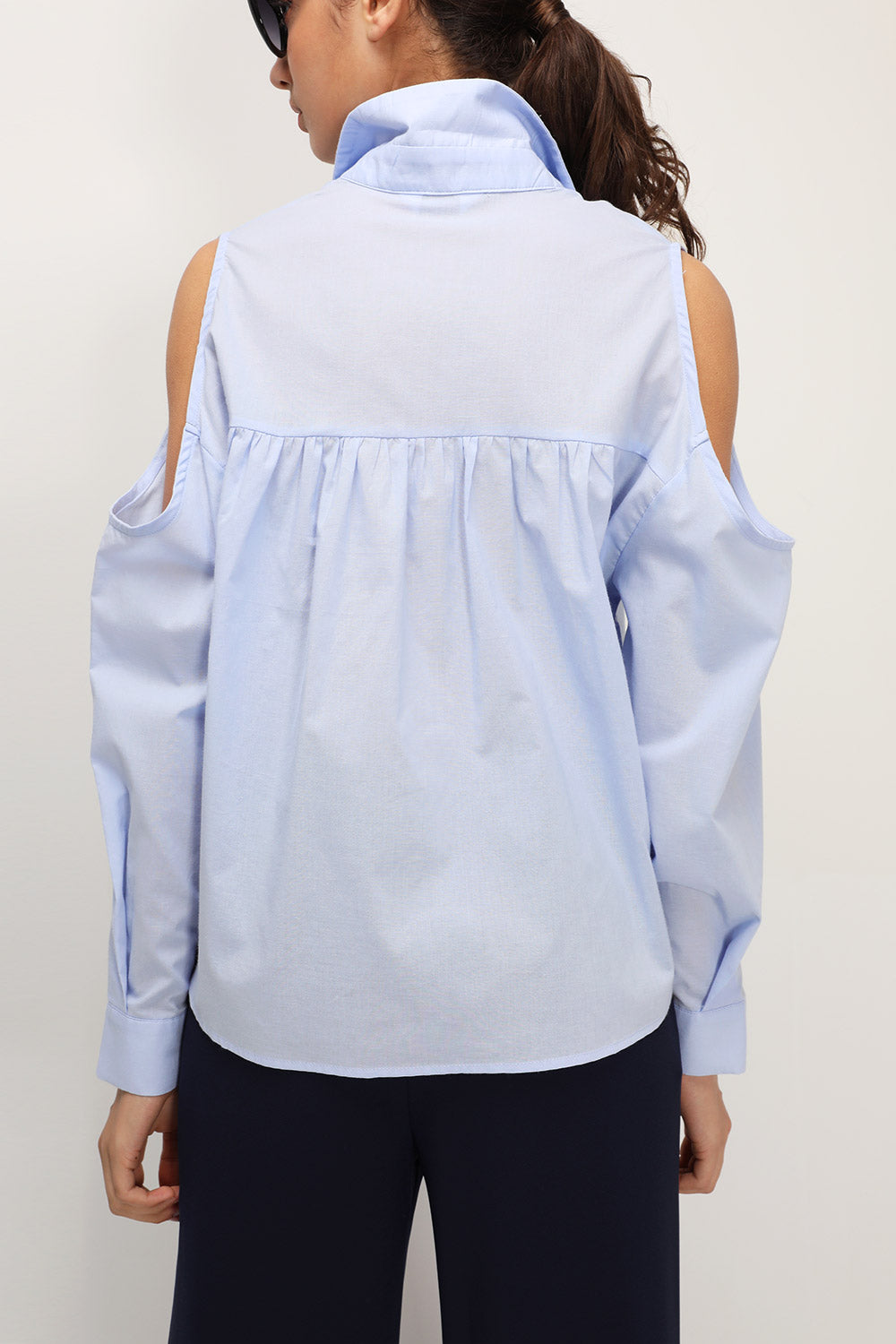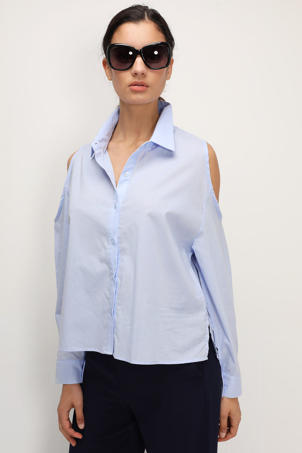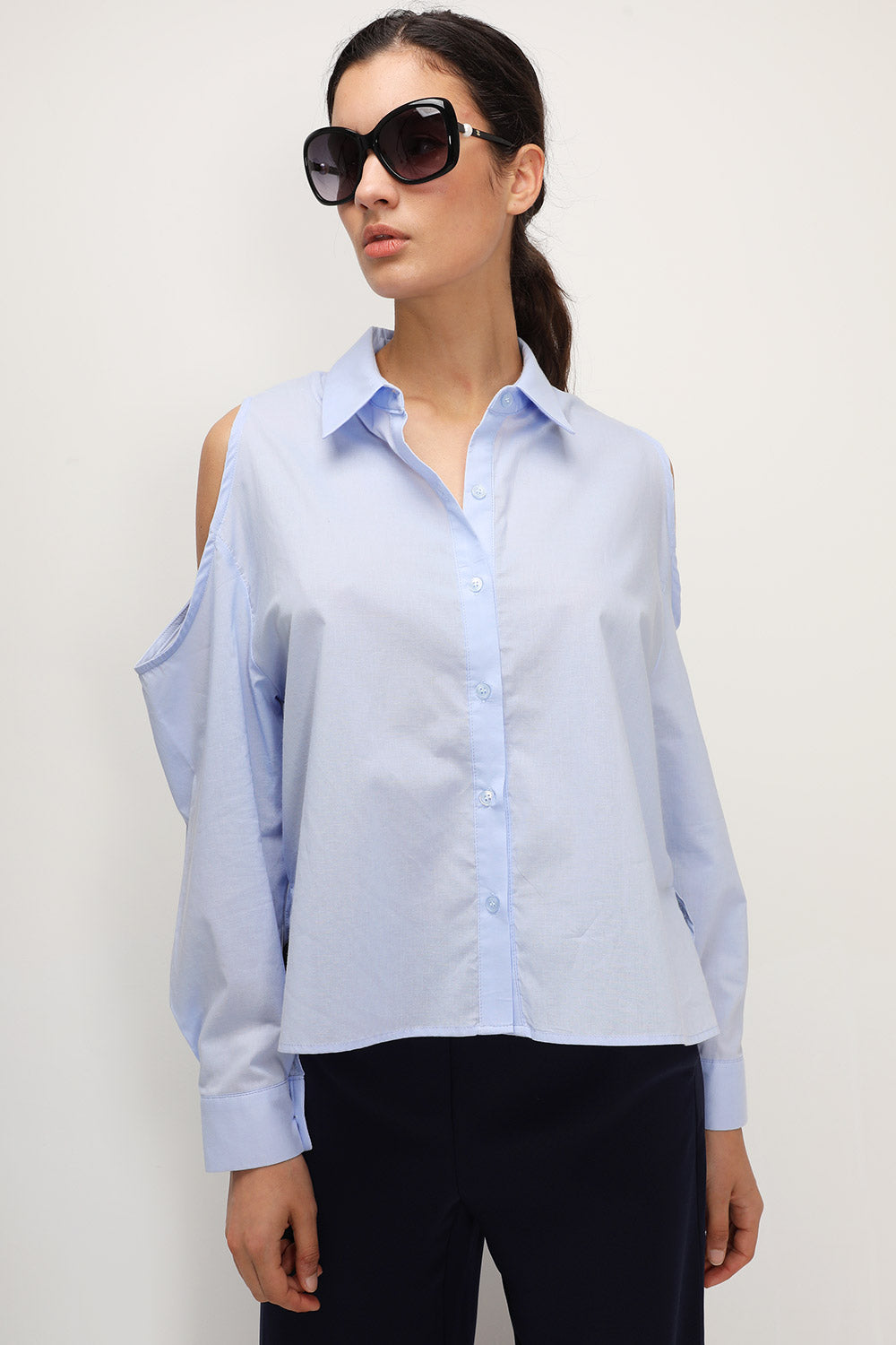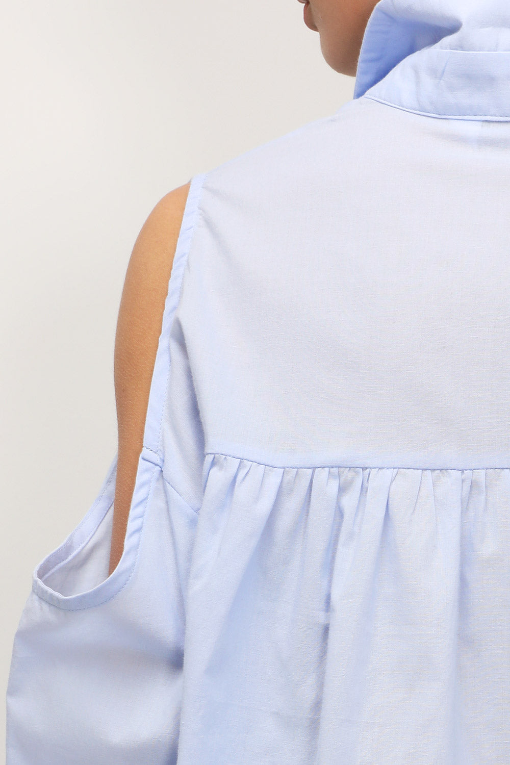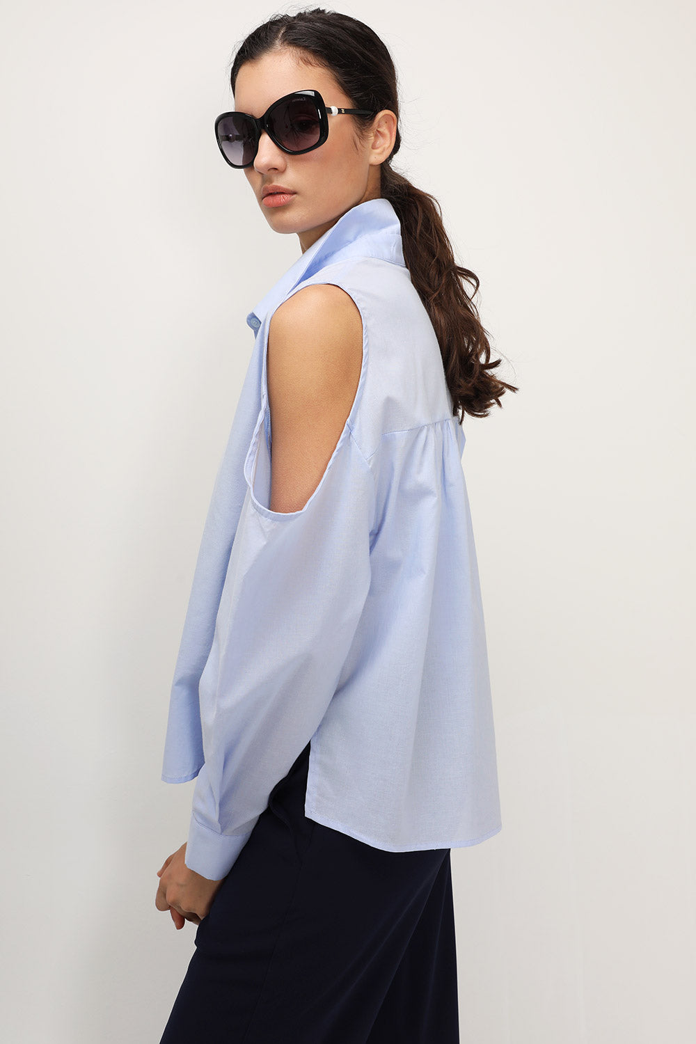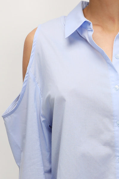 • This shirt features a cotton material all over with open shoulder details, a side slit detail at hem, and button down closure at front